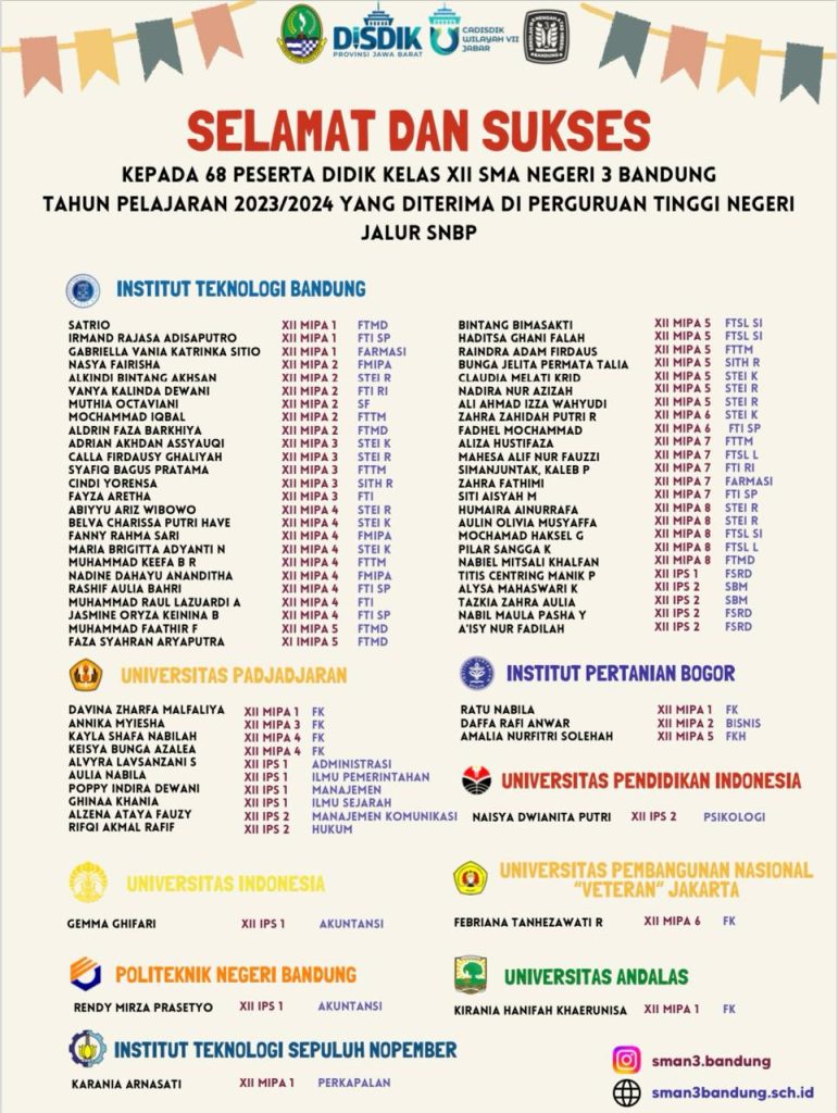 Kami segenap seluruh keluarga besar SMA Negeri 3 Bandung dengan bangga mengucapkan SELAMAT & SUKSES kepada 68 kelas XII SMA Negeri 3 Bandung yang telah lulus seleksi SNBP Tahun Ajaran 2023/2024.